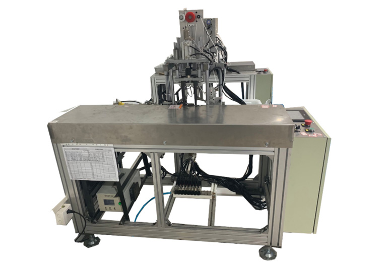 The equipment is manually placed into the positioning mold, the foot pedal switch is started, the rotating disk is turned to the ultrasonic ear loop welding place, the equipment starts to cut the ear loop at a fixed length, the air cylinder clamps the ear loop and sends it to the ultrasonic vibrator, presses down the welding, after the welding, the rotation continues to weld the other side, after the binding, the air cylinder lifts up to replace the new material and restarts.