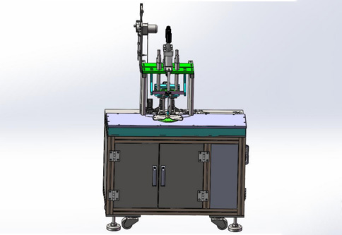 The equipment is manually placed into the positioning mold, the foot pedal switch is started, the rotating disk is turned to the ultrasonic ear loop welding place, the equipment starts to cut the ear loop at a fixed length, the air cylinder clamps the ear loop and sends it to the ultrasonic vibrator, presses down the welding, after the welding, the rotation continues to weld the other side, after the binding, the air cylinder lifts up to replace the new material and restarts.