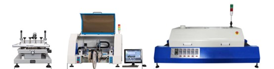 1.SMT贴片实训线由手动精密丝印台、贴片机、桌面五温区回流焊、实训操作台组成。